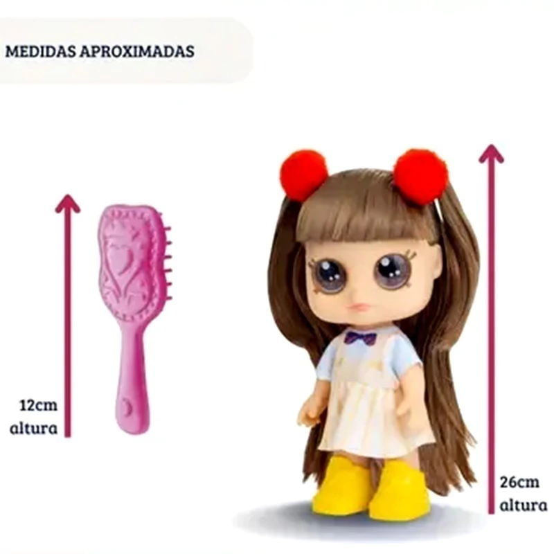 Seu visual moderno e figurino estiloso encantam, enquanto os cabelos podem ser penteados com a escova inclusa, estimulando a criatividade e o cuidado dos pequenos. O conjunto ainda traz um par de sapatinhos e uma cartela de adesivos personalizados das personagens, tornando cada momento ainda mais especial.