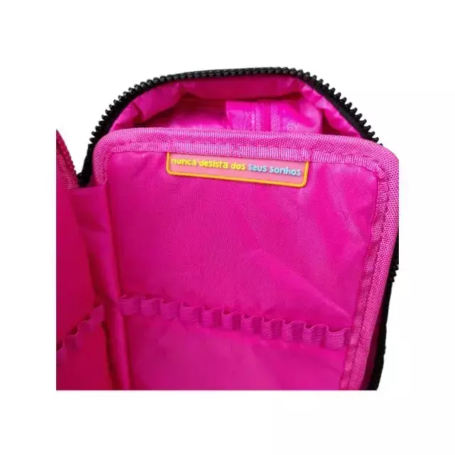 Sua estrutura conta com uma divisória central inteligente, equipada com separadores elásticos que acomodam até 36 lápis, canetas ou canetinhas, mantendo tudo no lugar com praticidade. Além disso, possui um bolso interno com fechamento em zíper, ideal para guardar pequenos itens com segurança.