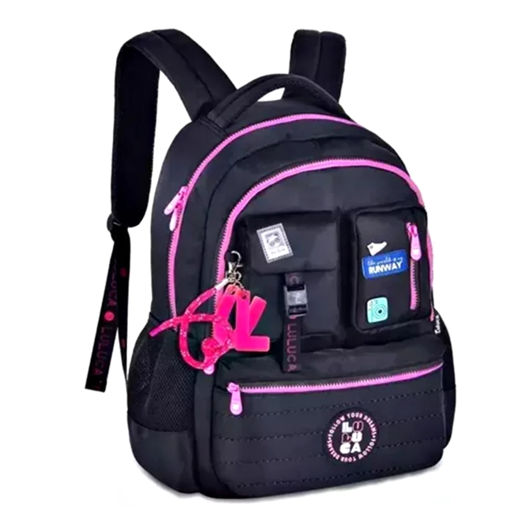 Além do charme, oferece fechamentos em zíper bicolor com puxadores personalizados para maior praticidade. Seu bolso principal é amplo e conta com compartimento interno para notebook e tablet, perfeito para proteger seus dispositivos com segurança. A organização fica ainda melhor com um bolso médio com divisórias internas, três bolsos frontais — dois com zíper e um com fivela magnética — e bolsos laterais telados para garrafinhas.